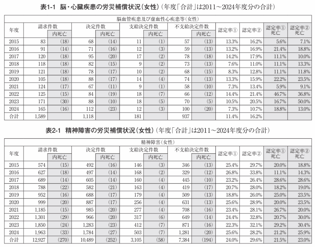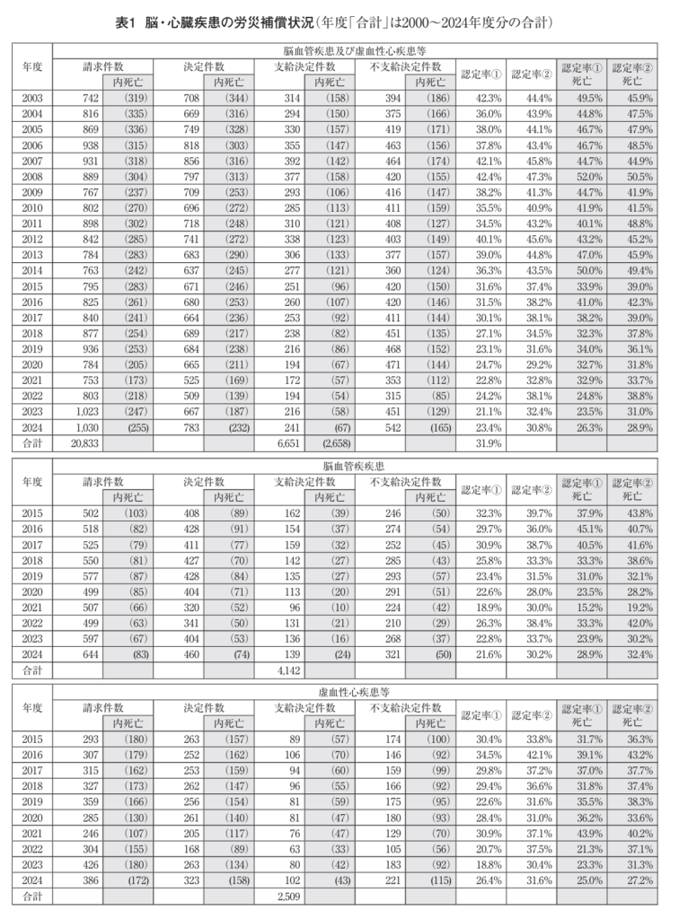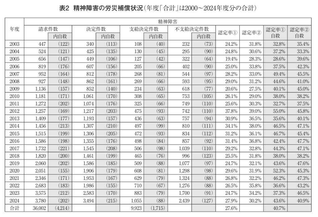 労災補償状況(請求・認定件数等)に関する表1及び表2の「合計」は2000~2024年度分の合計で、全年度分のデータがそろわない項目の「合計」は空欄とした。