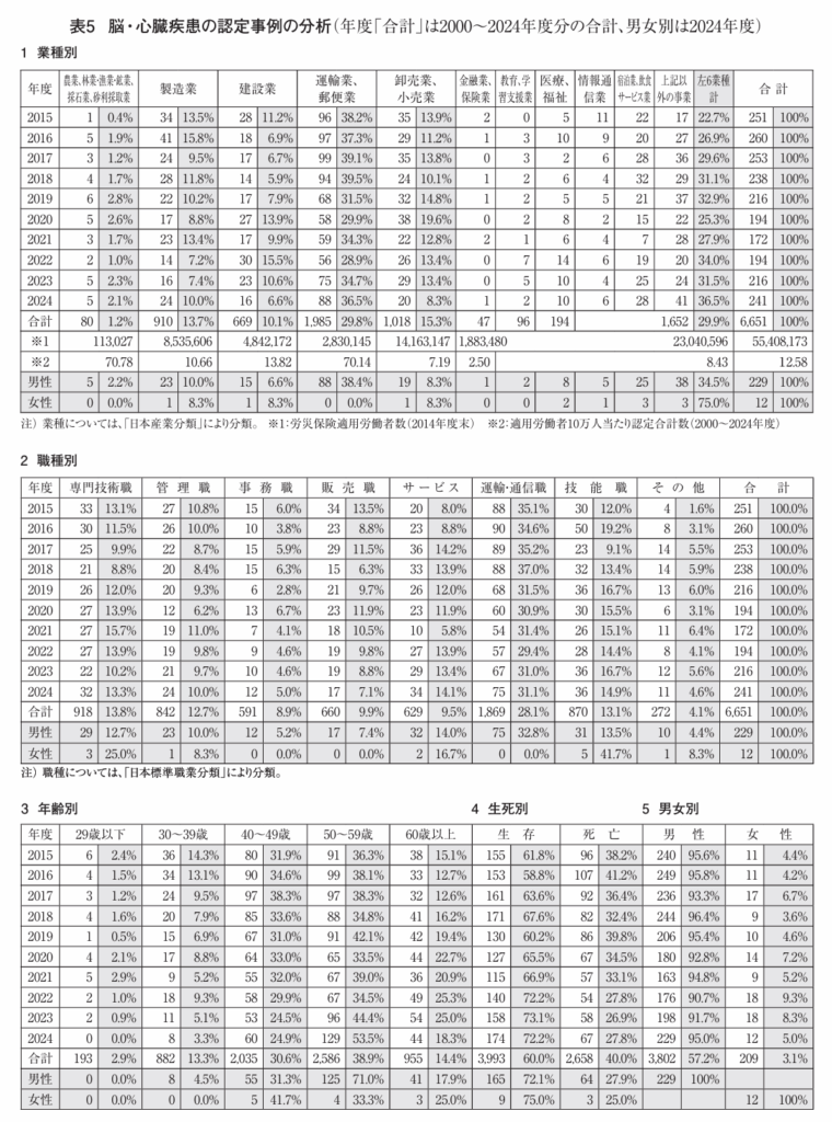 なお、脳血管疾患の方が虚血性心疾患よりも多く、性別では男性の方が女性よりも多く、女性の脳・心臓疾患の認定件数は、データのわかる2011年以来ずっと20件未満である(表5の「4 男女別」参照)。