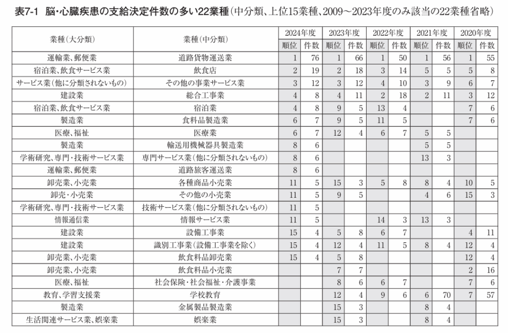 業種別では、脳・心臓疾患では、「道路貨物運送業」がダントツで毎年度トップ。「飲食店」、「その他の事業サービス業」、「総合工事業」も上位4位以内の常連である。