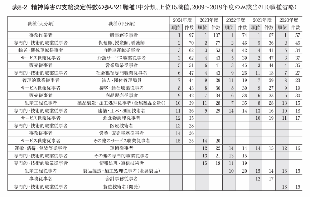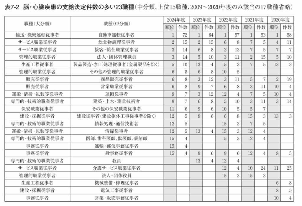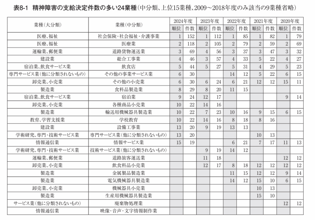 また、2009年度分から、「請求件数・支給決定件数の多い業種・職種(中分類・上位15)」が示されるようになったが、本誌では、表7及び表8に過去5年分の支給決定件数についてのデータのみを示す。空欄は、当該年度に上位15に該当しなかったためにデータがないことを意味しており、紙幅の都合から、一部の年度について当該年度に上位15に該当したもので掲載できていない業種・職種があることに注意していただきたい。2009年度以降10年間に支給決定件数の多い上位15に該当したのは、脳・心臓疾患で44業種(表7-1+23業種)、40職種(表7-2+17職種)、精神障害で33業種(表8-1+9業種)、31職種(表8-2+10職種)である。これらも、2014年度分以降分について、「男女別」データが利用できるようになっているが、表7及び表8では示していない。