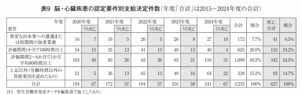 表9は、以上のようなかたちに加工した=「たんなる時間外労働時間別」ではなく「認定要件別」支給決定件数を示したものである。また、図3では、データのある2015年度以降の推移を示した。