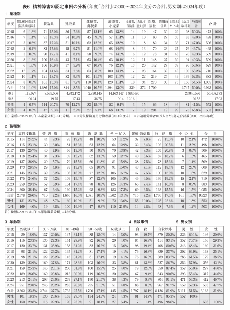 表5及び表6には、業種別、職種別、年齢別、生死/自殺別のデータを示した。請求件数・決定件数双方について示されているが、支給決定件数についてのデータのみを示す。脳・心臓疾患は1996年度分から、精神障害は1999年度分からデータがあるが、年度の「合計」欄には、2000~2024年度までの合計値を示した。これらも、2014年度分以降について、「男女別」データが利用できるようになっているが、表6及び表7では、最下欄に2024年度分についての男性及び女性のデータを示した。