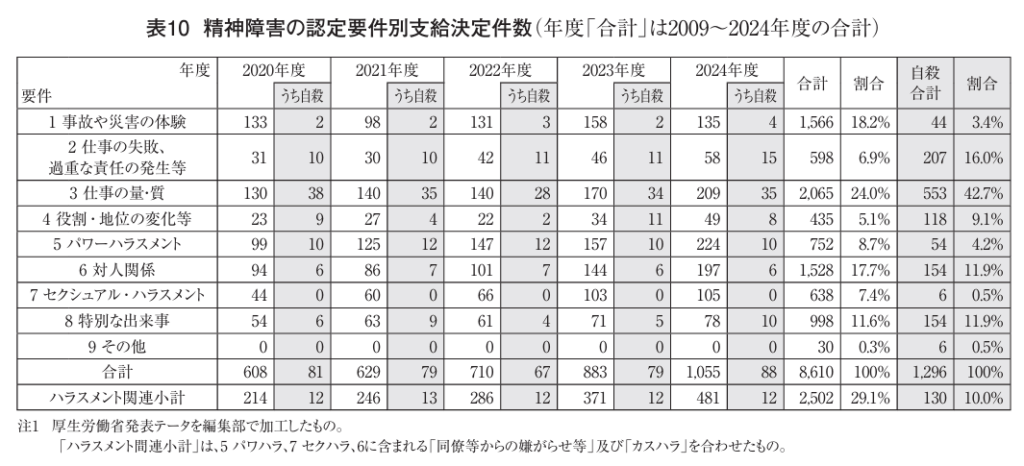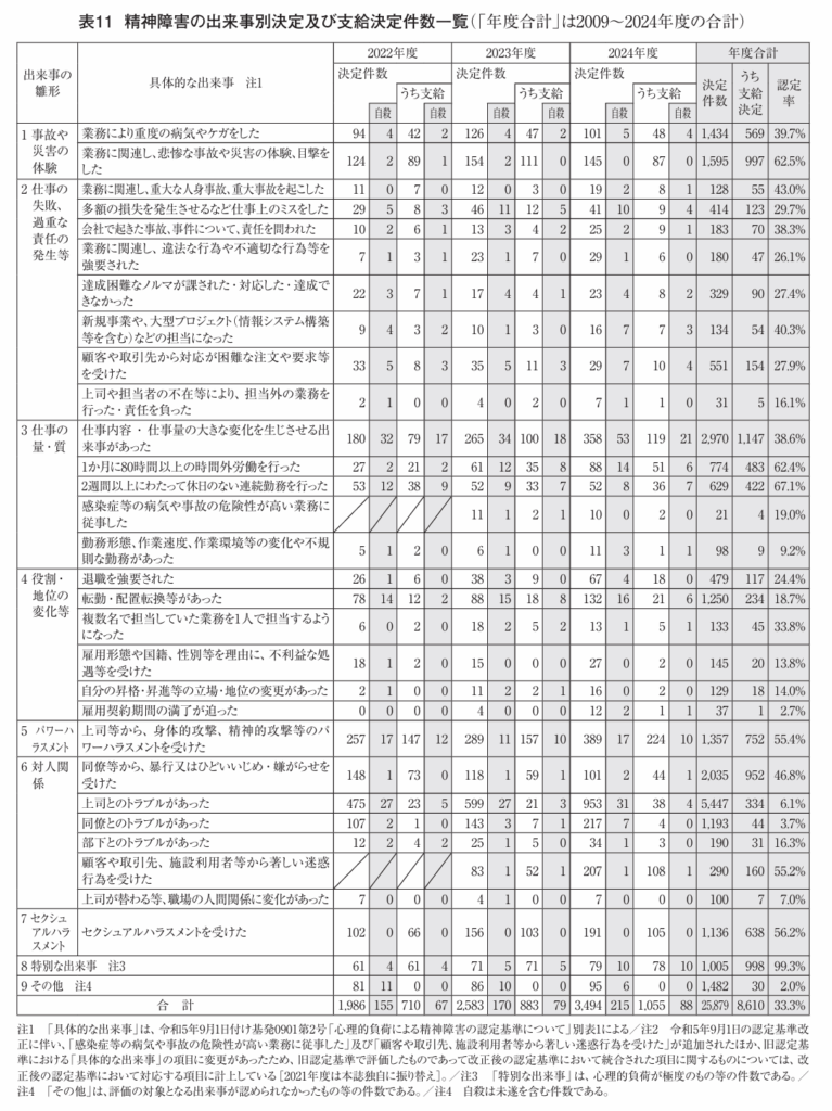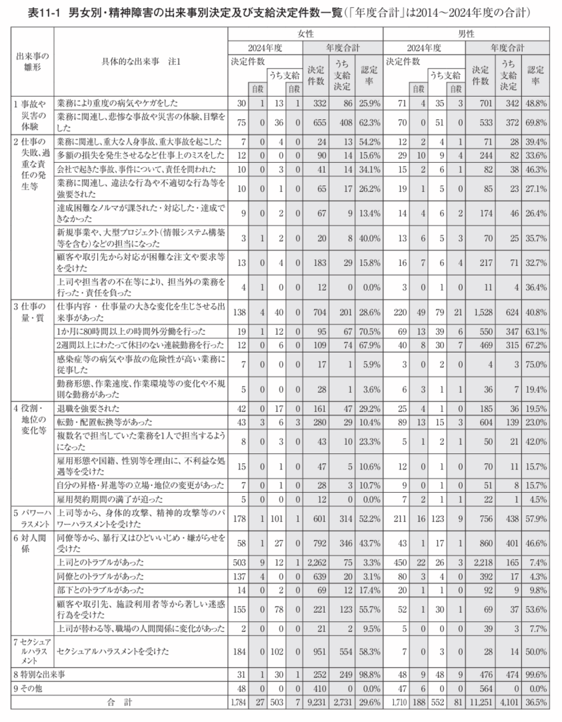2009年度分以降、「精神障害の出来事別決定及び支給決定件数」が公表され(表11)、2014年度分以降については、「男女別」データが利用できる(表11-1に、「男女別」の2024年度分及び「合計」データを示した)。