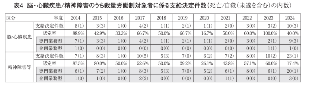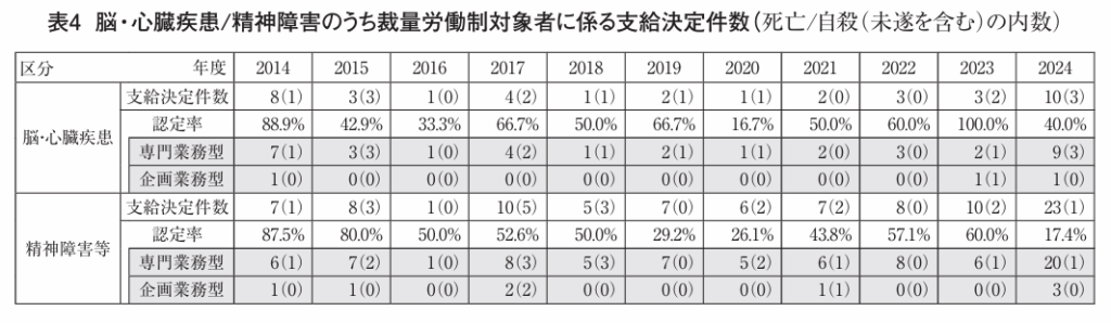 さらに、2011年度分以降、「裁量労働制対象者に係る支給決定件数」も公表され、2014年度分以降は「決定件数」と「認定率」も追加されるようになった。死亡/自殺の内数も示されているが、男女別内訳はない(表4-決定件数は省略)。