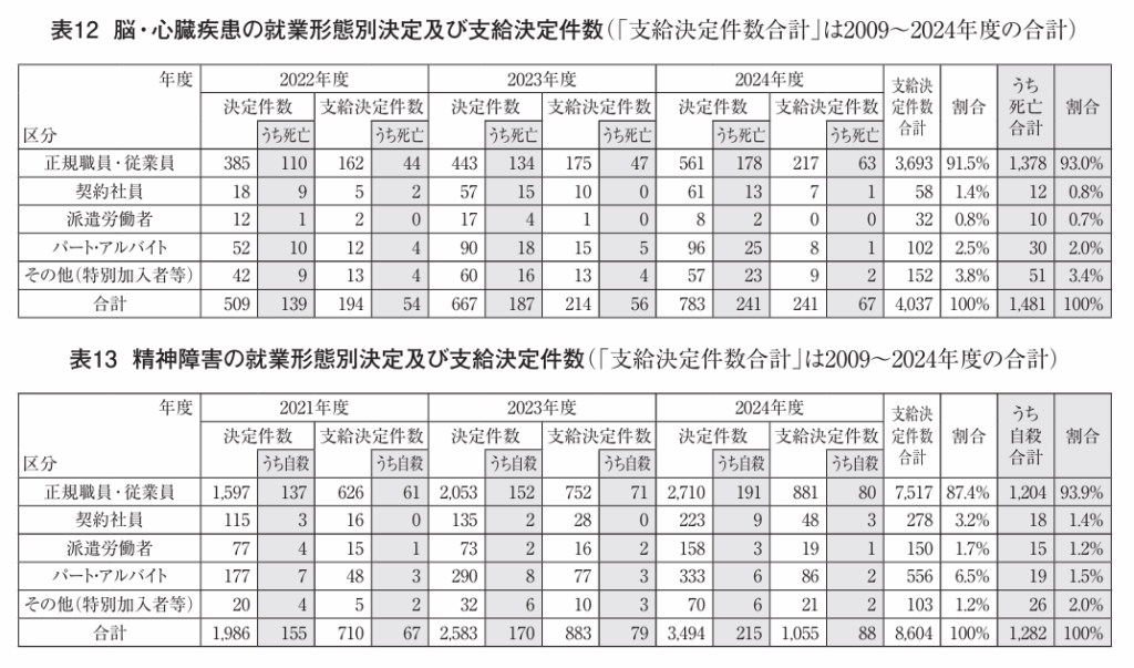 「就業形態別」決定及び支給決定件数も2009年度分から公表されており、表12及び表13に示した。「合計」欄には、2009年度から2024年度までの合計値を示してある。2014年度分以降、「男女別」データが利用できるが、本誌では示していない。