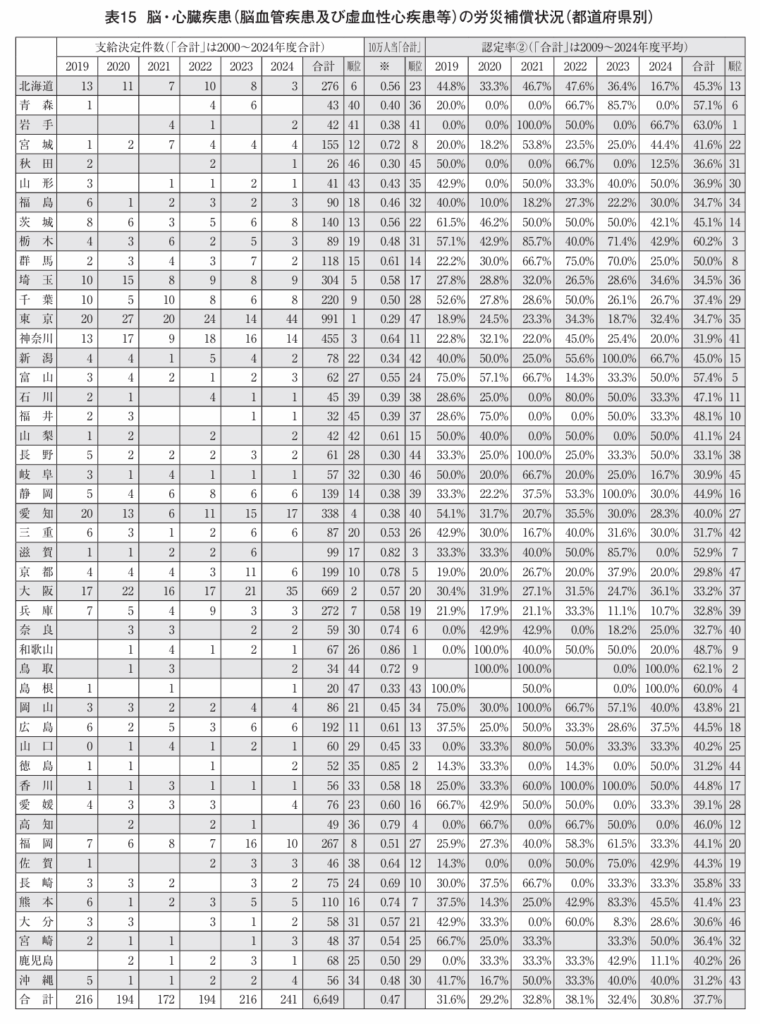 支給決定件数の「合計」欄には、2000年度から2024年度までの合計値を示してある。2015年度末労災保険適用労働者数をもとに10万人当たりの2000~2024年度認定合計数も計算してみた。2009年度以降、都道府県別の決定件数が公表されるようになり、認定率②が計算できるようになった。認定率②の「平均」は、2009~2024年度の平均認定率である。「都道府県別」データも、2014年度以降分について、「男女別」データが利用できるようになったが、表15~16では示していない。この間、全国安全センターでは、都道府県別の認定率のばらつき=認定率の低い都道府県における改善の必要性を提起しているところであり、より詳細な情報公表及び分析が求められる。