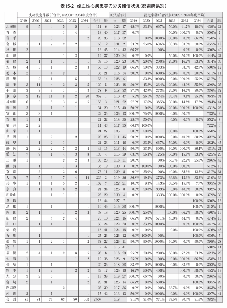 脳・心臓疾患の認定件数は、表2に示されていない1987~94年度は18~34件、1995~99年度は31~90件。2000年度は85件で、認定基準が改正された2001年度143件、2002年317件と連続して増加し、2007年度392件までは微増傾向だったものの、その後2010年度285件まで減少した後、2012年度338件まで持ち直し、以降は減少し続けて、2021年度は172件まで下がった。こちらも、2022年度は194件、2023年度は216件、2024年度は241件へと増加に転じてはいるものの、過去最高(2007年度の392件)を更新するには至っていない。