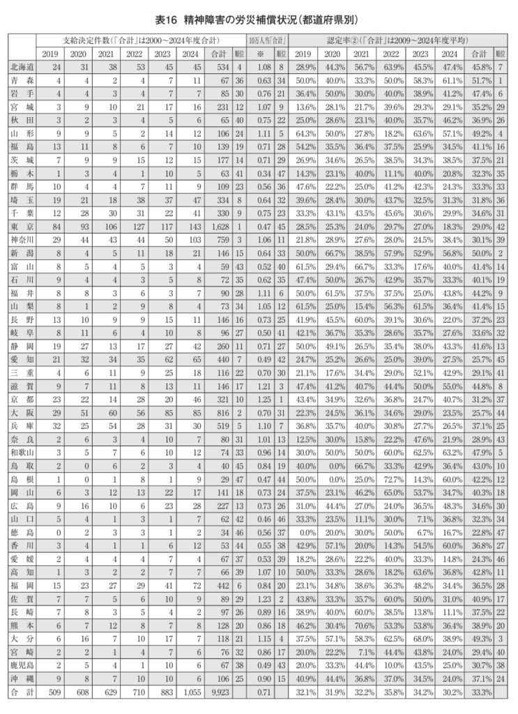 精神障害の認定率は、2012年度に過去最高の39.0%までは増加がみられ、2013年度から2016年度は30%台後半を維持したものの、2017年度に32.8%と大きく減少、2018年度も31.8%とさらに減少、2019年度32.1%、2020年度31.9%、2021年度32.2%と、低いレベルにとどまった。2022年度には久しぶりに35.8%に増加したが、2023年度34.2%、2024年度は30.2%へと減少が続いている。