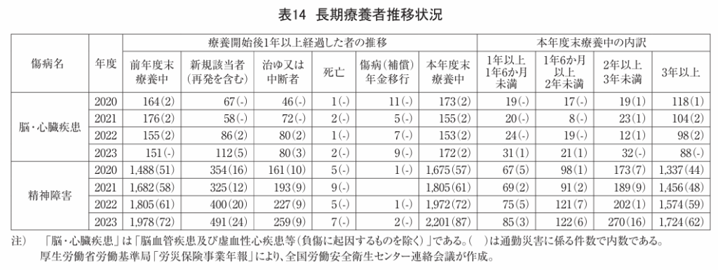 内外で調査・文献の実施・収集等もなされたようだが、労災保険事業年報の「傷病別長期療養者」統計に、2020年度版から、脳血管疾患及び虚血性心疾患(負傷に起因するものを除く)、精神障害に係るデータも掲載されるようになった(表14)。これによって、新規認定者数に加えて、前年度末療養中、当該年度に新規に療養開始後1年以上経過者に該当した者、治ゆ及び中断者、死亡、傷病(補償)年金移行者、及び年度末療養中の者の療養期間別内訳がわかるようになった。障害(補償)給付移行者や休業の状況等に関する情報も公表して、療養者の推移をより全体的に把握できるようにしたうえで、状況と課題の分析に努めるべきである。