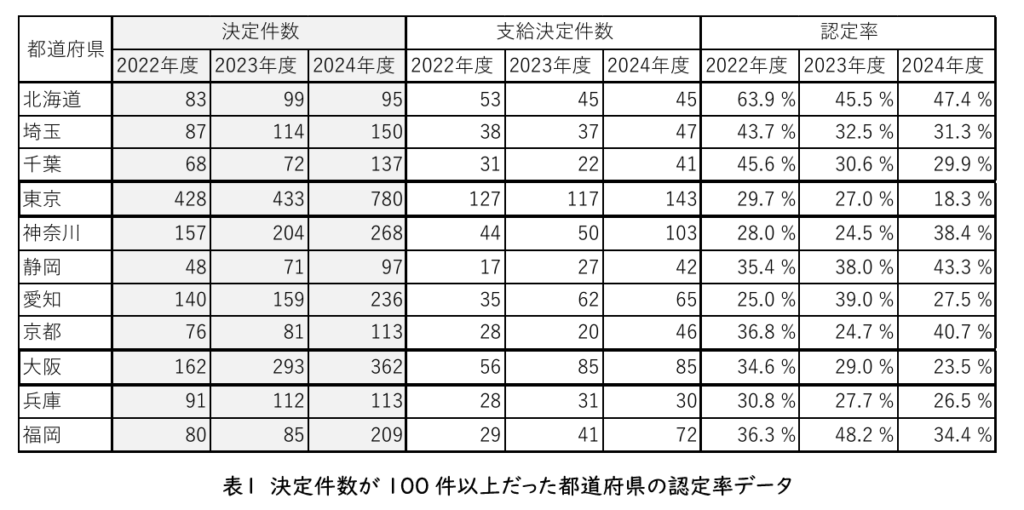 ここで、東京と大阪に注目しましょう。この2つの地域は、3年間決定件数ベスト1と2であり、2024年度の決定件数90件以上の都道府県中で認定率ワースト1と2でもあります。また、共通して言えることとして、2022年度から2024年度にかけて急激に決定件数が増加し(東京352件、大阪200件)、それに伴って認定率が下がっています。