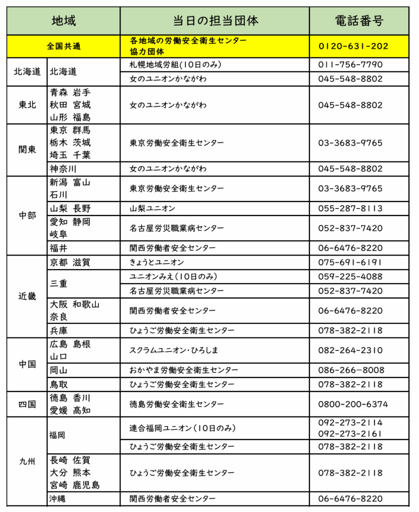 メンタル労災・ハラスメント全国一斉ほっとライン~北海道・山梨・東京・神奈川・愛知・大阪・京都・兵庫・岡山・広島・徳島・福岡など~