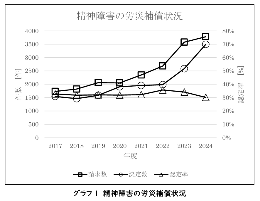 1 精神疾患の労災の請求数、決定数、認定率と、認定に関する問題について