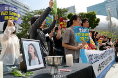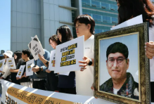 故イ・デソン氏の妻のキムさん(一番右)が、夫のイ・デソン氏の写真を持って勤労福祉公団ソウル南部支社の前で記者会見をしている。 ソン・ドンフン記者